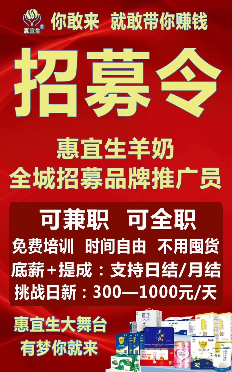 2024-07-21 找工作 0 评论 56 喜欢 分享 缘姐 招募令 惠宜生羊奶全城招募品牌推广员,可兼职,可全职,免费培训,时间自由,不用囤货,底薪+提成:支持日结/月结,挑战日新:300--1000元/天 联系电话:📞13055352768(小缘) 查看TA的全部内容 +关注 龙海网 去发现更多有趣内容 微信扫码打开龙海网小程序 体验更多「龙海网」新功能 评论 0 我也来讲两句